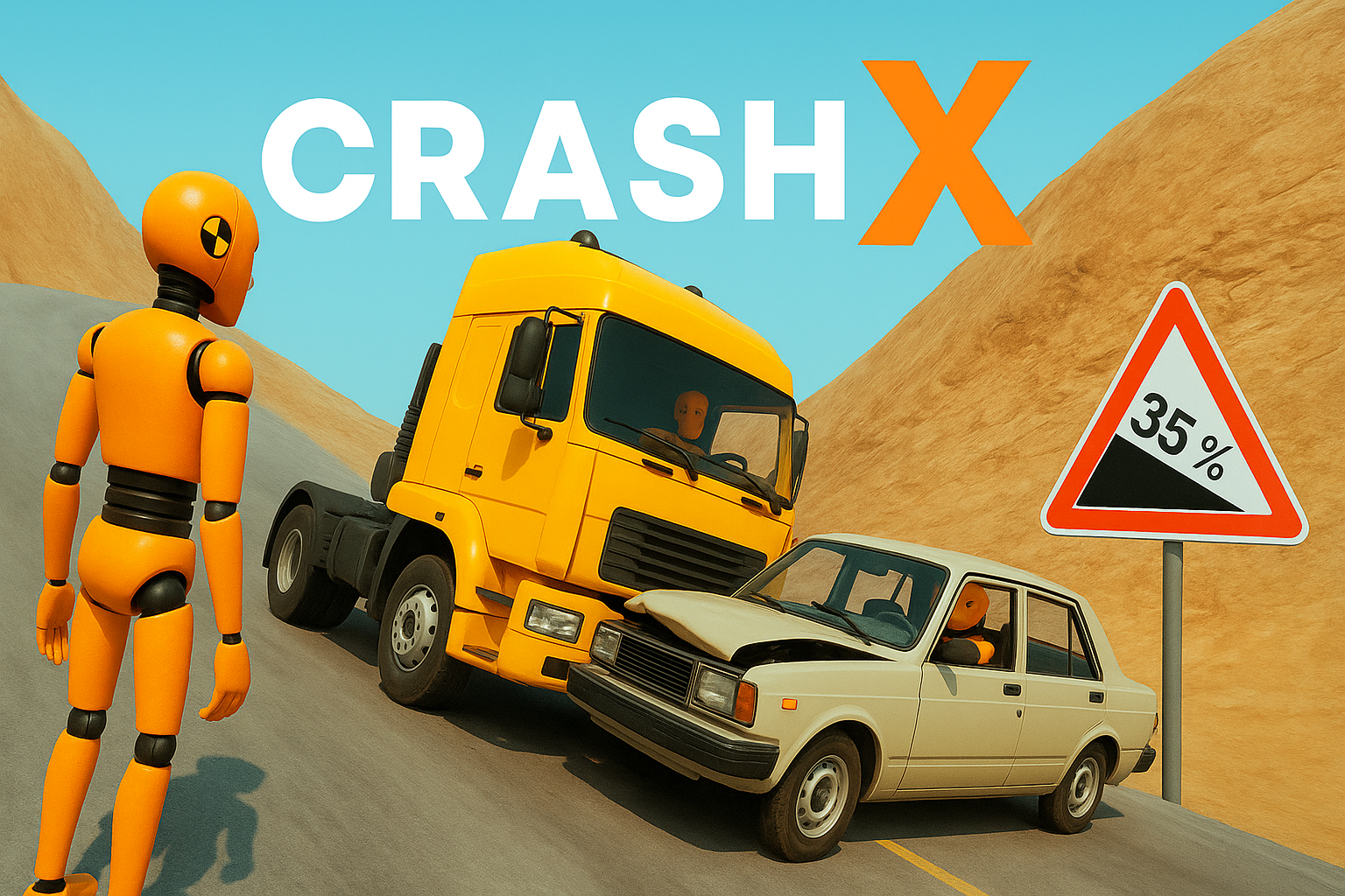 Crash X is the ultimate car destruction simulator that combines realistic physics with high-octane gameplay. Featuring an advanced soft-body physics engine, every crash, impact, and deformation is precisely calculated. Choose your driver—either a professional crash test dummy or a daring schoolboy—and get ready to push your cars to the limit.